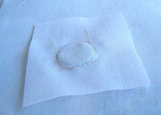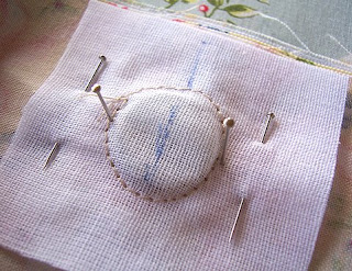 6. Pin a sew-in magnet into place - centred over the cross. Also push pins through all layers of the fabric on both side of the magnet.