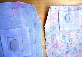 10. Stitch aroound the side seams and across the base of each pair in a squared U-shape - pivoting at the bottom corners (see below). Leave the top end open (this is the short end closest to the 'flap' crease-line).