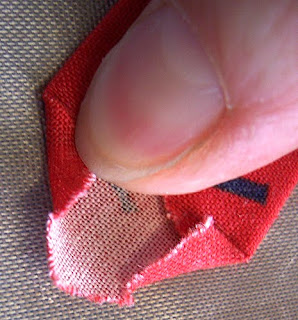 15. On the pointed ends of both fabric strips, turn the corners in and fold the top over as shown below.