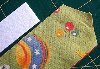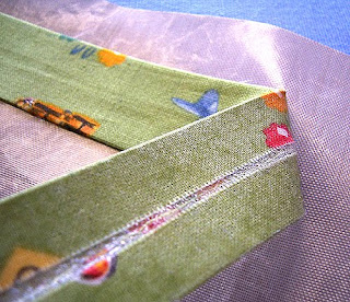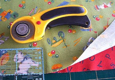 1. Lay up two pieces of cute kiddie-print fabric. It's best to go on the straight grain that's parallel to the selvage (because the fabric is more stable in that direction) but not absolutely essential. I didn't because I didn't have the length of fabric in the prints I liked the best.