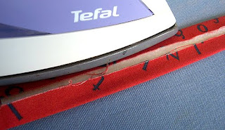 7. As you pull the fabric strip through, press the folds of fabric toward the centre. See if you can control the fabric (with a tiny zig-zag motion with the iron or by using fingers) to leave an even gap of a few mms between the raw edges at the centre of the tape. That will make the next stage a little easier.