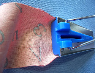 6. Start to thread a fabric strip through the bias tape maker. You made need to use a pin, tailors awl or unpicker to help ease it through to the opening at the front.