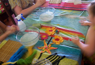 Lara and I discussed felting as a children's activity probably best for kids of at least three or four years of age ....although 2-year-old Stella enthusiastically soaped, rolled and created that little colourful squiggly ball thing. She beamed with pride. (The sqiggly ball thing started off as string - an easy thing to start kids on).