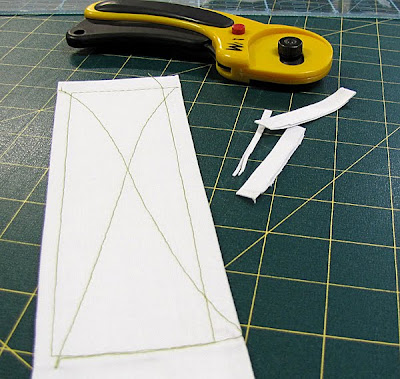 3. Cut a piece of Peltex (it doesn't matter if it's single-sided or double-sided fusible) or heavy weight Fast2Fuse to the (rounded down) dimensions of the base seams. (I find that a rotary cutter and quilting ruler are the business for this job).