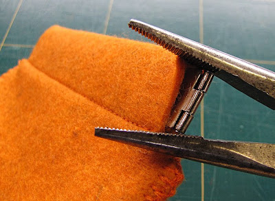 The pouch was constructed in the same way as my tutorial for the 90mm pouches. Only by this stage, I've learned that my beaky-nosed pliers are the right tool for closing over the ends of the hinge.