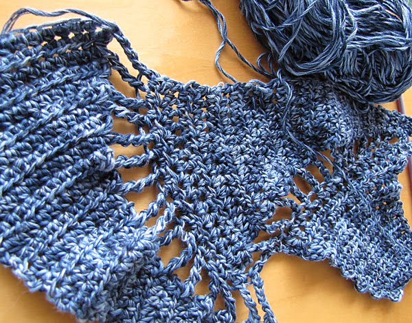 This thing has been worked and reworked and I finally have the idea of how to do it. (Lara - cancel that lesson, we'll just have a cuppa instead!). This yarn doesn't photograph well, but it's a rather lovely denim-coloured cotton yarn called "Amalfi" - bought in the Lincraft yarn sale.