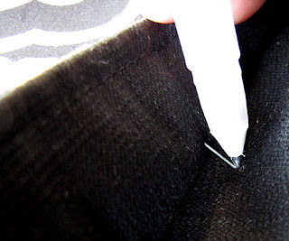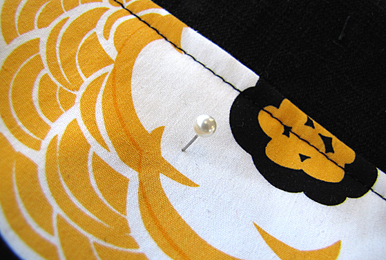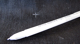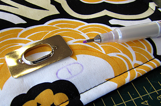 3. Mark (with a small dot) where the pin goes through the bag body. This is the vertical placement of the lock. (I use a Clover white marking pen on dark fabric. It disappears when you iron it, so it doesn't matter if you accidentally mark the wrong spot).