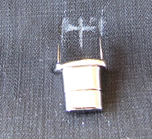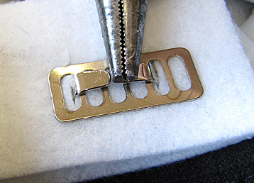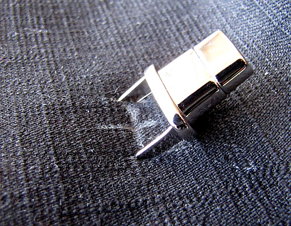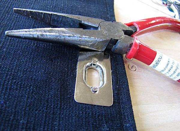10. Place the metal plate over the back of the support interfacing and prongs, and then fold the prongs inward. If you can balance the twist lock on the table, a quick little tap with a hammer will help to flatten the prongs.