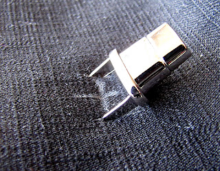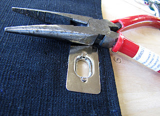 18. Pop the back plate on and fold over the little tabs. Voila! Shiny, shiny and super-slick twist lock... that will never EVER pull through the fabric!!!