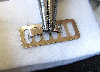 13. Use the sharpest small scissors you own to snip away the oval shape, including the pen marks. (If you have punched the two holes, you can easily snip from the edge of one hole to the other. By doing this on both sides, you have created a rough oval shape, which will only need a little bit of tidying up).14.Ok. This is where my neurotic perfectionism comes in....We've just cut through centre-front on the bag. We're going to place a feature fitting, which is also the major stress-point on the bag. What we don't want is a feature point becoming the first place to show wear-and tear. Likewise, we don't want nasty little raw ends poking out through the centre of that lovely, shiny front plate.