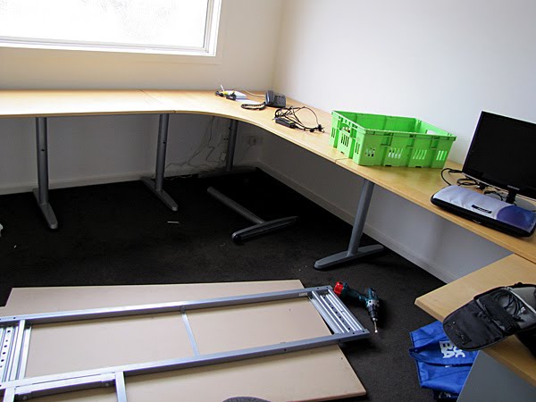 This is the office. I'd carefully measured the Ikea desks and - working from the official floorplans of the room - planned the layout carefully. What I didn't count on was the skirting boards and minor inaccuracies in the floorplan making the room 2cm too small to fit the desks, no matter which way I arranged them.