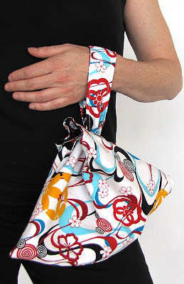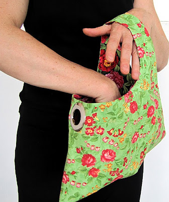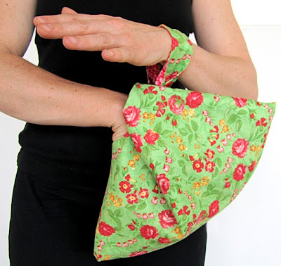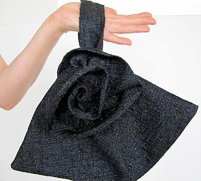 The Fan Bag tarts up quite well with a bit of razzle-dazzle fabric and a bias-cut rose*, too...