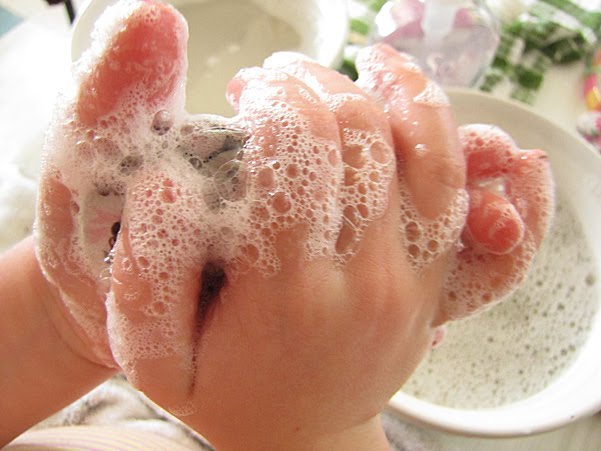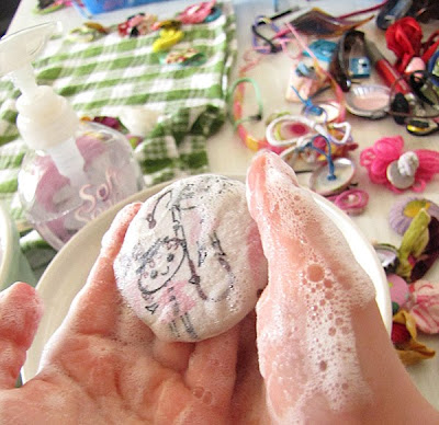 Nothing like free rein with a pump pack of soft soap to engage the girls enthusiasm..... she washed them all. We brightened up buttons, washed and re-shaped yo-yo's, then quick-dried them in the outdoor oven (read: outside on the cement footpath).