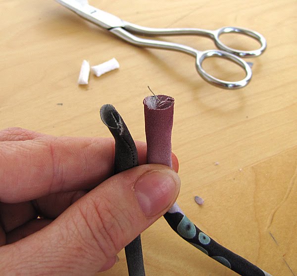 6. Snip off the uncovered cord and the stitched end of the bias strip.