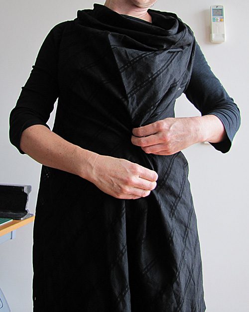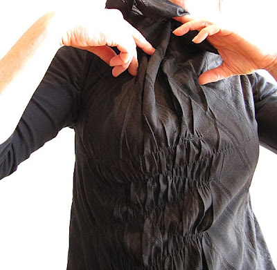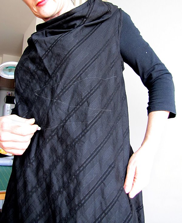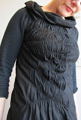 I made a cotton lawn/voile variation-weave version of my pattern-free trapese-line top (instructions in my book). Using myself as a tailor's dummy, I played around with where to decrease volume and increase texture.