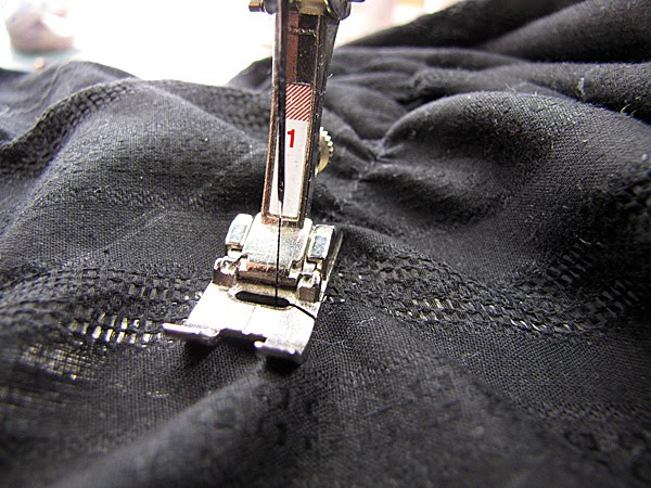 I hand-wound a bobbin with black shirring elastic, putting a bit of tension on it (stretching it slightly) as I wound. Using a large straight stitch, I followed the white lines with the sewing machine...