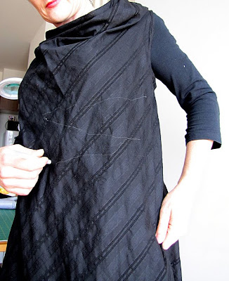 I then drew in a few lines between the widest points of the "decrease volume" area with a white marker pen. (You could use chalk if you wanted to wash the garment before wearing it - I wanted to be able to wear it straight away so opted for a disappearing marker pen).