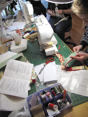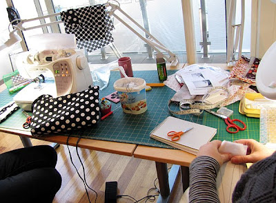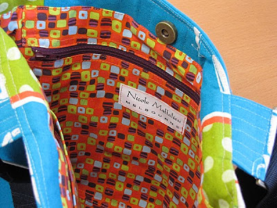 I squeezed the body of a bag out of the teensiest piece of Echino scooter fabric and used webbing for the strap. The adjustable strap goes from one side of the bag to the other.Saturday was another very full day of bag-making in my studio. Lots of fabric, lots of sewing, lots of cups of tea.... I gave lots of tips on ways to use interfacing, reduce bulk in seams, turn out sharp corners and create smooth lines and edges. I taught people to insert magnetic snaps and twist locks. I taught a few people to overcome zipper-phobia. I taught the girls a few tricks about making nice, neat straps with rings. I even gave a good example of why everyone should follow my advice to separate the lining pattern from the outside bag pattern before cutting any fabric, lest (in a moment of lapsed concentration) the wrong piece be cut.