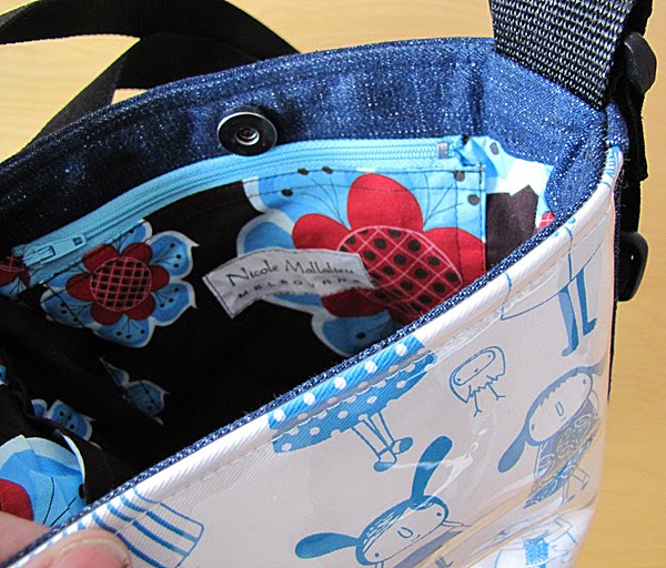 ..including a facing, a magnetic snap and a simple zippered pocket. I decided to tart it up with a bit of Auntie Cookie fabric, denim and clear PVC. The straps were easy-peasy webbing.
