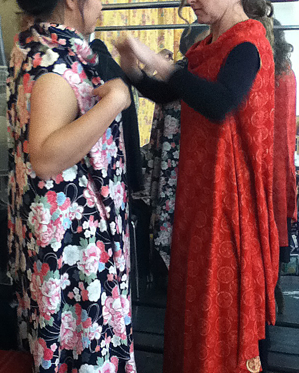..although they do hint at the camaraderie and cooperation as we threw fabric about, draped it around ourselves and cut away the bits that didn't look like glamorously draped tops, tunics and dresses.Before we started hacking into the lovely Japanese jerseys, we had a rehearsal with cheap-as-chips black cotton jersey. It was great to see that by the time we got to the precious stuff, the girls had the confidence to dive in with adventurous spirits and rotary cutters blazing.