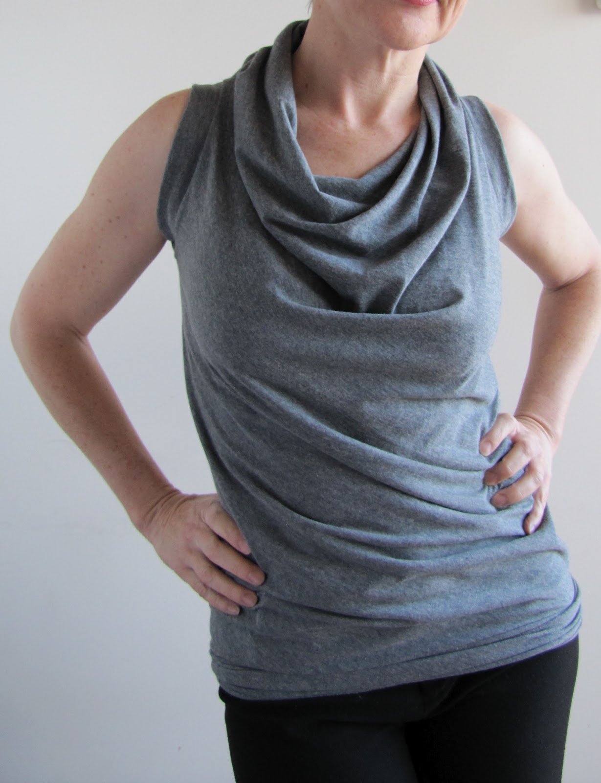 Then I whipped up a few quick little summer tops. This marl grey cotton-lycra number is slimmed right down to hug the hips and emphasise the drape across the front.