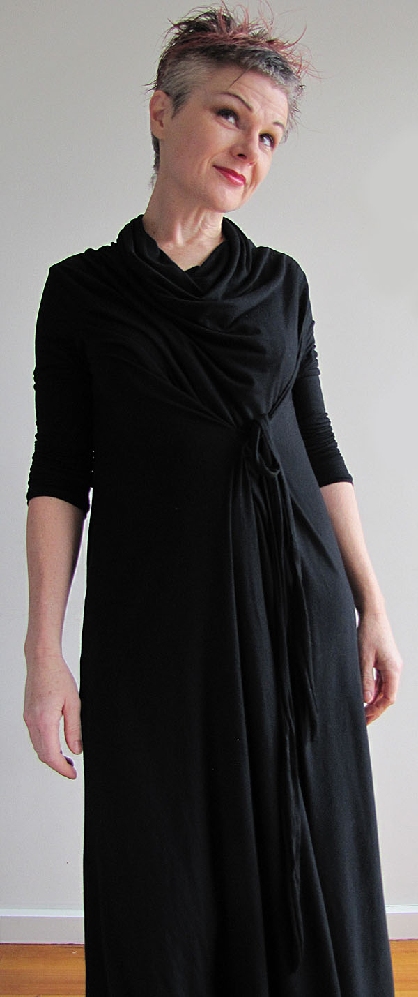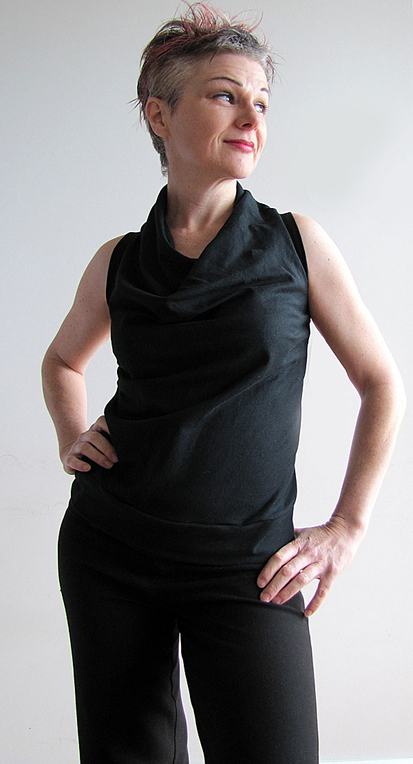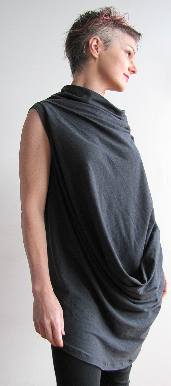 This black top (below) is a pure cotton jersey, so not as drapey as its lycra-blend cousins. I turned a wide hem and made a fake binding (instructions in my book or in my Draped T-Dress pattern) that sits on the hip. It emphasises the boxy shape that the fabric wants to create.This one below is a toile (muslin), in a drapey knit remnant that was wider than it was long. I played about with a different fold and came up with a drape detail that I think needs further experimentation.... I'm going to come back to this one.