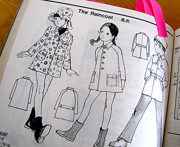 I've borrowed my sewing buddie's (Japanese) Pattern Drafting Vol III book (borrowed, because I can't seem to find my own copy for less than $150, these days!). It was published in 1972, so the silhouettes are inspiring a healthy dose of nostalgia for the things that I wore as a kid, and the illustrations are an absolute delight.